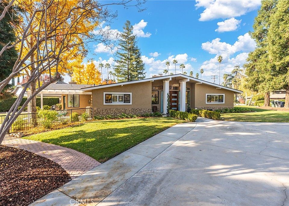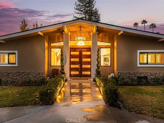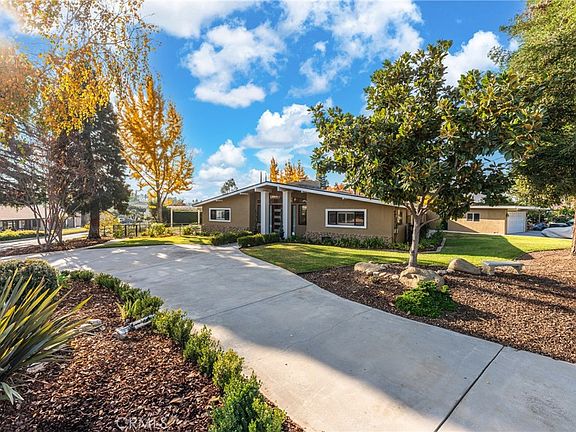 This single-story California contemporary ranch is in a prime South Redlands location, completed with an attached ADU. It is a lovely corner lot, adorned with old growth foliage and orange trees including navel and mandarin - truly meticulous maintained landscaping. As you step inside, prepare to be awestruck by the stunning foyer, featuring a mesmerizing marble-look double-sided fireplace. The soaring vaulted ceilings create an airy and open ambiance, while an abundance of natural light floods the space, thanks to the sky-lit dining room. Spread across 3,280 square feet, this home offers ample room for your family's needs. Walnut engineered hardwood flows through the main home. The stunning kitchen is perfect for entertainment with an expansive layout, boasts a spacious seating area that includes a comfy window seat, perfect for enjoying a cup of coffee or reading a book bathed in natural light. The modern amenities, such as stainless steel appliances, a 6-burner Jen Air cooktop, a wine fridge, and double ovens, seamlessly blend with the timeless elegance of marble countertops and are complemented by the convenience of a well-appointed walk-in pantry. The main home has three bedrooms & three bathrooms. The 1 bed 1 bath attached ADU comes with its own kitchen, laundry, fireplace and entrance and beautiful solid oak floors. It is a completely private suite. Everyone has their own private retreat, and some bedrooms have their own mini splits for energy efficient heating and air. The master bedroom is complete with its own jacuzzi tub and tons of closet space. Shutter windows throughout the home, ensuring peace and tranquility. Step outside, and you'll be welcomed by a backyard haven. The huge pool, BBQ/kitchen area, a cozy fire pit and covered patio right off of the dining room are perfect for hosting unforgettable gatherings. This remarkable property offers two driveways, providing abundant parking options. With a detached garage, covered parking, and even space for your RV. The property also features two fenced yards, offering plenty of space for children and pets to play. Complete with 1.5 water shares, 33 Solar panels (paid for system), two tankless water heaters, and a brand new roof! If you have a green thumb, there's even potential for gardening. Don't miss out on this dream home, designed for entertainers and those who appreciate the finer things in life.