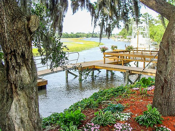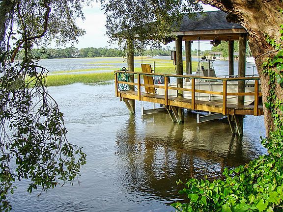 Fabulous deep-water compound with dock, floating dock, and covered boat lift (up to 25' boat). Enjoy outdoor entertaining with magnificent views of the marsh and river from beautifully landscaped backyard, large deck,with bar seating, and outdoor hot tub. Brick main house features gourmet kitchen, 3 bedrooms and 2.5 baths (with granite and marble finishes), library, living room with home theater, and dining room Fabulous waterfront lot with marsh views and protected waterway access.