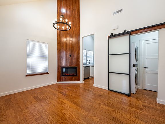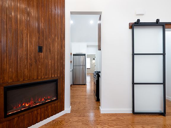 Modern fixturesStainless steel appliancesElectric fireplaceGranite countertopsTall ceilings