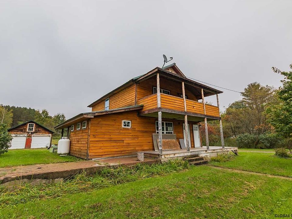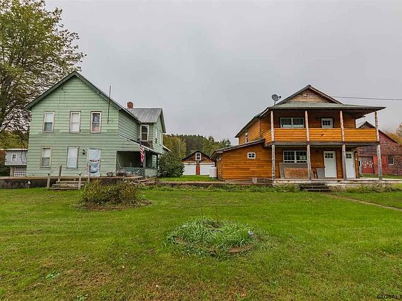 This property features home on 10 acres w a Pond, Barn and garage. The Brown home is a 2 fam with up (1Bd/1Ba) renovations completed and down (2Bd/1Ba) framed. 35 x 40 Barn. Some newer Roofs. Live in one unit and finish the others with income potential.