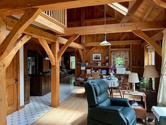Located on the shore of the Piscataquis River, this custom hand-built Timber Frame Home by local craftsman Richard Millett is truly one of the finest examples of timber frame construction that you will see anywhere. There are cathedral ceilings with hand crafted post and beam pegged construction throughout. There is a quality kitchen with island, pocket doors to a formal living room, a breakfast nook, den area & formal dining room. There is a huge first floor master bedroom with its own bath. A lovely balcony over looks the first floor and leads to two second floor bedrooms. The sunroom provides a beautiful space to sit and enjoy the views of the backyard. The basement area has 30'X30' finished room with atrium doors to the back yard, ample storage space with an extra bedroom area. There is an energy efficient water heater, radiant baseboard heat and two heat pumps. Cathedral ceilings & skylights provide ample sunlight. The home has over 1400 oak pegs, the timber framed floor carriage consists of 8X8 and 6X6 hemlock timbers and the house itself consists of 8X8 and 6X6 cedar framing with walls and ceilings of shiplap pine. There is also a 36X36 timber framed garage which has 6X6 pine framing w/ over 700 oak pegs and board siding. The lot is 7.5 acres with 480 feet of frontage on the Piscataquis River, with the house located well off the road, providing plenty of privacy and quiet while still being near schools, shopping, hospital, dining and the YMCA.