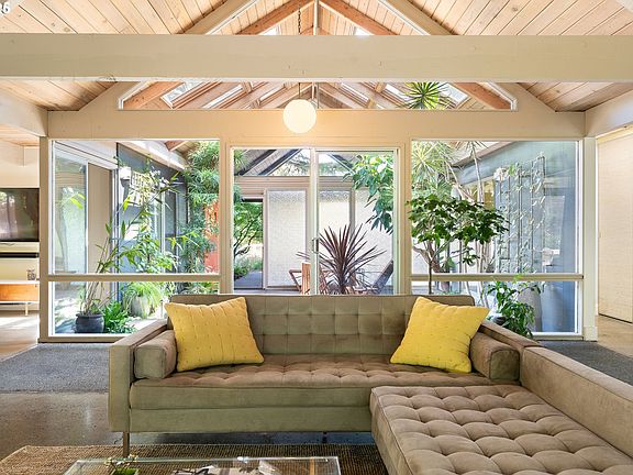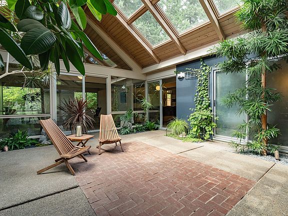 Rare Double Gable Rummer built home in the Taliesen tract of Highland Hills. One of the largest Rummer floor plans in existence, this unique architectural gem thrills with a dual A-frame roofline that provides soaring tongue and groove wood vaulted ceilings and exposed beams within. Enter through the central, natural light+plant filled atrium that seamlessly blends the indoor and outdoor spaces. The main living space features floor to ceiling windows and a wood burning fireplace.Featuring polished concrete flooring with radiant heating, period light fixtures and A/C (heat pump) throughout the home. A fully renovated kitchen featuring designer updates in the custom walnut cabinetry and a beautiful dimensional tile backsplash feature wall. Cooks will enjoy plenty of prep area along the sleek quartz counters, stainless appliances and a walk-in pantry. The adjacent living space provides a comfortable lounge area while a dedicated dining room is perfect for entertaining larger groups.The one-level floor plan wraps around the central atrium with 3 bedrooms, 1 full bathroom and laundry area in one wing and the primary bedroom + office/flex space along the other. The primary suite offers an original sunken Roman bath design updated with modern tile, a walk-in closet and a custom walnut vanity with a double concrete sink and a chic Ann Saks tile backsplash. Sliding glass doors along the back of the home connect to a landscaped backyard that perfectly balances modern hardscaping with soft natural elements. The property borders Taliesen Park providing a lush,private forested backdrop. Located at the end of a cul de sac with new exterior paint and modern landscaping giving this gorgeous home so much curb appeal.The attached garage + carport and a large driveway provides plenty of off street parking.Close to downtown Beaverton that is full of local restaurants,shops,farmers market,Nike,Intel.