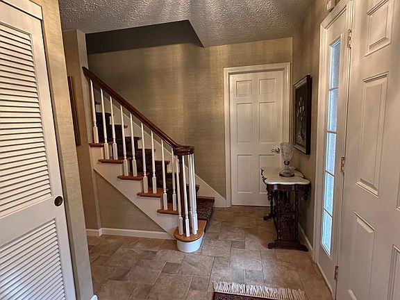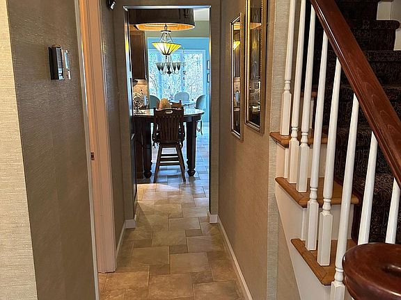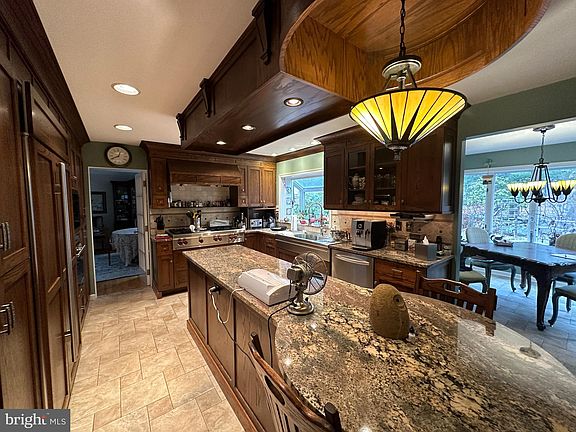 This gorgeous two-story brick and siding home is a must-see. It boasts six bedrooms, three and a half bathrooms, and has been lovingly updated. The kitchen shines with custom oak cabinets, a ceramic backsplash, garden window, and granite counters with a built-in compost bin. There's also a Wolf range, double wall oven with microwave, warming drawer, and a Sub-Zero refrigerator. The entry foyer, hafl bath, kitchen, and breakfast room have ceramic floors with radiant electric heat. Off the kitchen is a pantry, laundry room, and a spacious family room with lots of natural light and a converted gas fireplace. There's a formal living room and dining room, and a main level en-suite. Upstairs are five bedrooms, including a second en-suite with cork flooring and a full bath. It can also be used as a great room that opens to a large 22x8 Trex deck overlooking the backyard. There's a remodeled hallway bath with glass tile, deep soaking tub, and quartz vanity. The home has Oak hardwood floors on the first and second levels. The lower level is an L-shaped rec room with wet bar. There's a half bath and utility area, as well as a two-car side entry garage. The 2.1-acre lot is wooded and has a stream. There's a natural stone patio with a lily pond and waterfall, plus a fenced garden area with berry bushes and room for vegetables. Three storage buildings and a wood shed complete the property, as well as a lovely natural stone wall in great shape in the front and side. The recently repaved circular driveway offers plenty of parking. Pride of ownership is evident throughout.