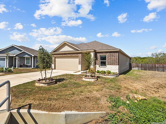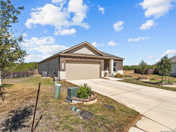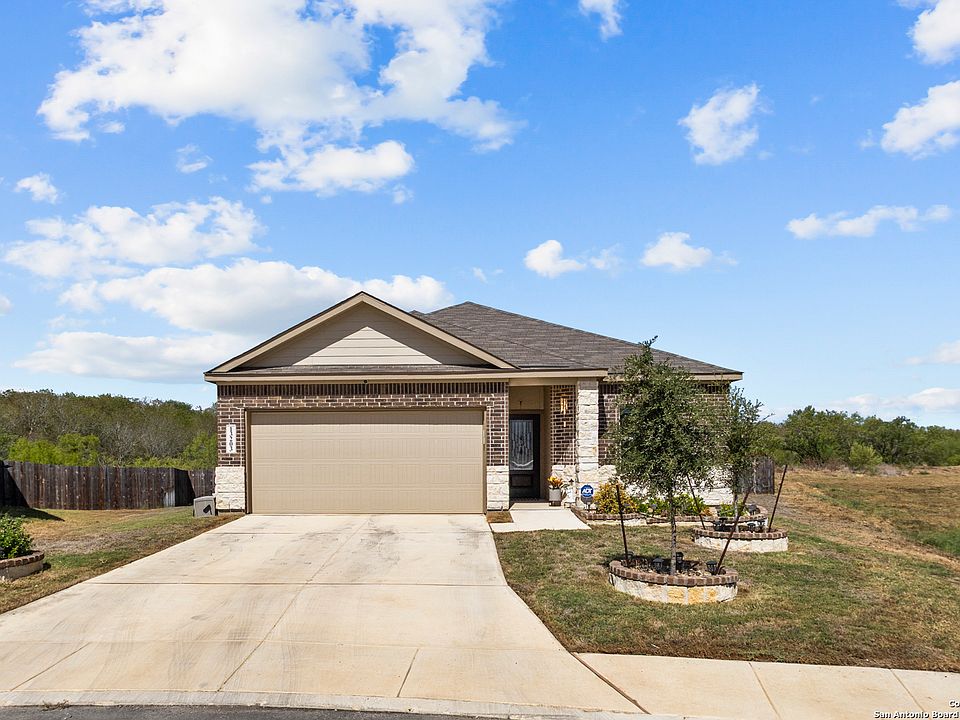 Welcome to 13203 Turnesa Terrace, a beautiful 4-bedroom, 3-bathroom home located on a quiet cul-de-sac in South San Antonio. Sitting on a large lot that is professionally landscaped and backs up to a peaceful greenbelt with jogging trails, this home offers plenty of space both inside and out. Step inside to an open-concept layout that seamlessly connects the living room, kitchen, and dining area-perfect for entertaining family and friends. The kitchen offers generous quartz countertops, counter space, and cabinetry, while the living room and all bedrooms feature ceiling fans for added comfort. The home also includes blinds and valances throughout, and they all remain. The spacious master suite includes a full bath with a double vanity, a walk-in shower, and a large walk-in closet. The home also features durable luxury vinyl plank flooring throughout and quartz countertops in all bathrooms. Enjoy the spacious screened-in and enclosed sunroom with composite flooring, ideal for relaxing year-round, and the charming stonework on the front exterior that adds great curb appeal. For security and peace of mind, the ADT alarm system includes three cameras-above the garage, the doorbell, and on the deck. With its thoughtful updates and inviting spaces, this home blends comfort, functionality, and style in a peaceful neighborhood setting.