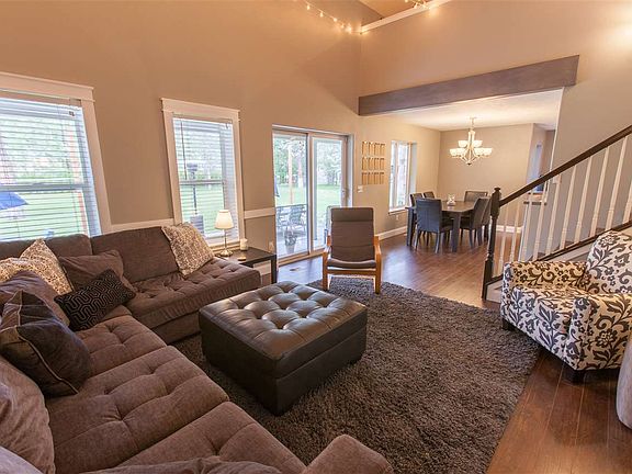 Over 3500sqft 4 bedroom, 3 bath home with soaring cathedral ceilings, master suite on main level with slider to hot tub and patio. Over 1 acre of gorgeous flat fenced landscaped yard with sprinkler system and room for shop. Outdoor activities include volleyball, golf, full basketball ct and space for more. The basement features media room and bedroom with walk-in closet, bath and vanity. Fresh paint, updates, unique energy efficient construction, Drivit siding, gas heat, AC and lake access available.