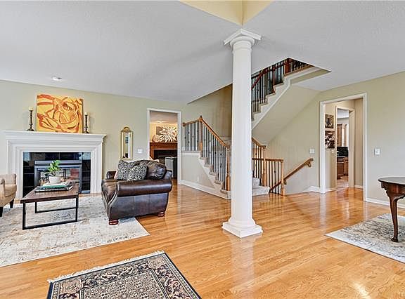 Wonderful home in highly desirable Wilshire Place*Hardwoods throughout main*Large 10 x 10 Entry warmly welcomes you into this clean & well maintained home that has the perfect flow for entertaining*Large windows allow great natural light*Focal point of Living Room is beautiful see-through fireplace*Huge 5 x 5 granite island with seating*Walk-in pantry*Stainless Steel appliances include built in range, wall oven & warming drawer*Birch cabinets with granite countertops & backsplash in Kitchen*Quaint main floor Office with glass pane pocket door, fireplace & built in bookshelf is a bonus especially for those working from home*Generous Hearth Room includes a second fireplace*Laundry Room has sink & built-ins including a desk*Outdoor patio with a canopy of trees provide privacy & shade*4 generous size Bedrooms all with walk in closets*Jack & Jill Bathroom connects Bedrooms 1 & 2 while Bedroom 3 enjoys a private Bath*Master Bedroom includes cozy sitting area with fireplace*Master Bath with separate his & her vanities, tub, & shower with bench*Master closet allows his & her separate areas*Lower Level Rec Room has daylight windows with a walk-out/walk up sporting a darling mural on outside wall*Non-Conforming 5th Bedroom or Exercise Room*Subdivision is located adjacent to Leawood's Gezer Park*Sellers love that this home is located 4 houses or just around the corner from the awesome amenities which include a swimming pool with slide, tennis court, basketball court and play area!