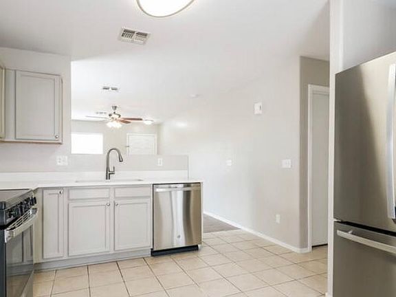 Check out this beautiful three-bedroom, two-bathroom home in Surprise, AZ. Featuring a two-car garage and a large fenced-in backyard, this newly renovated Southwestern-style home boasts a spacious open floor plan. The front door opens into the living room, where a light illuminates the foyer area. You'll also find a lighted ceiling fan and two windows for plenty of natural light. You'll love cooking in the eat-in kitchen, which includes a walk-in pantry, quartz countertops, and stainless-steel appliances. From the nook, access a sliding glass door that leads to a covered patio within the backyard. Relax in the private master suite and stay organized using the walk-in closet.