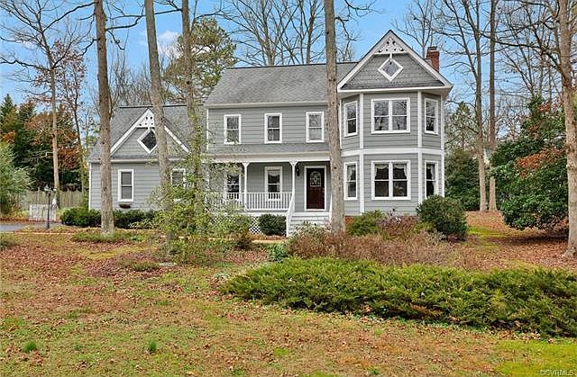 Back on market due to no fault of seller. Purchaser financing fell through.Beautiful Victorian home located on large wooded lot in cul-de-sac. Freshly painted with new carpet. Large Family room has exposed beamed ceiling with ceiling fan and built in book cases on both sides of brick gas fireplace (new gas logs) . Living room is bright with bay/bow windows as well as master bedroom. Master bedroom has master bath with lg.walk in closet. All wood floors on first floor with crown molding and chair rail in dining room. Kitchen has large breakfast nook with two skylights that leads out onto private deck and back stair case to second floor. Community pool and play ground. Drive way freshly coated and sealed. Crawl space inspected. Trees trimmed, Chimney cap newly installed.Much sought after Midlothian schools. subdivision is located in Midlothian Village area off Coalfield Rd. Queensmill is a wooded relaxing atmosphere on Lg. lots close to St. Francis Medical center. Queensmill has its own recreation area with swimming pool and childrens playground.