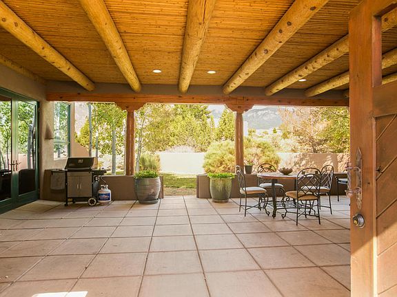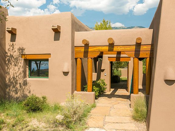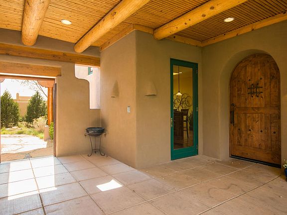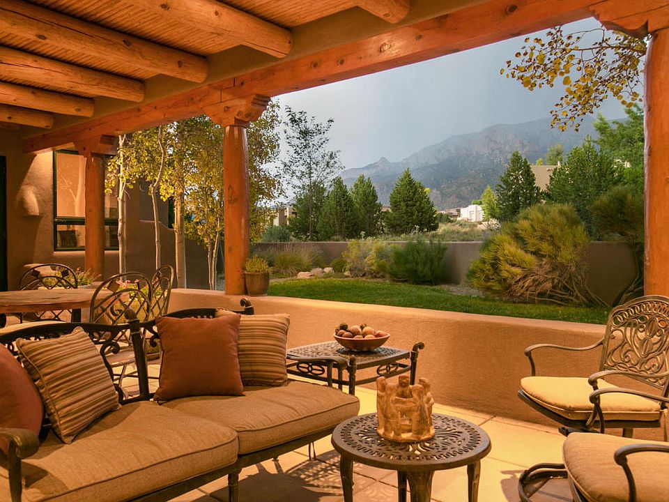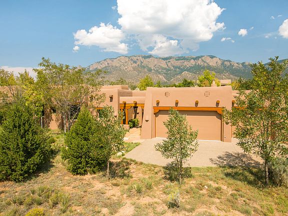 A rare, 1-story, ABQ Dream Home with executive appointments thoughtfully designed and a perfect match for those who want fewer bedrooms but extraordinary indoor/outdoor living spaces. Perfectly situated on a .85 acre estate lot in the highly sought after Mountain Highlands in High Desert offering beautiful SW charming architecture, custom finishes, mature landscaping & endless views. Main house includes; incredible Wood Viga & T&G Viga beamed ceilings, plaster Kiva fireplace, gourmet chef's kitchen, formal/informal dining areas, 2 luxurious bedrooms ensuite. Beautiful gated entry opens into an airy covered portal/living space w/Kiva FP that connects the Guestroom ensuite, where you and/or your guests can relax & enjoy the ambiance of the enchanting & majestic city & sandia mountain views!