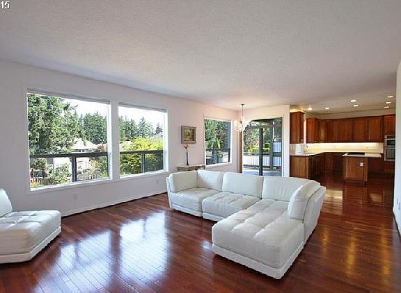 Like a new home! Luxurious Brazilian wood floors with custom inlays, soaring ceilings and walls of windows! New white quartz, counters, gas appliances. HUGE family room with fireplace. Master suite has soak tub, super big walk-in closet & balcony! 4 lrg bedrooms upstairs with Den/5th Bedroom on main floor. Outside there's an organic garden, fruit trees, water feature, two decks, covered patio and backs to an expansive greenbelt!
