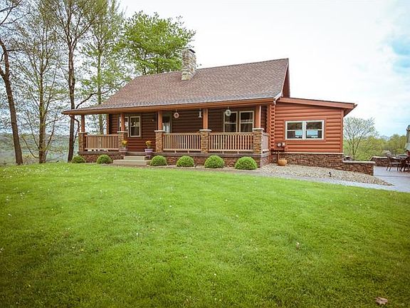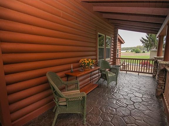 Impeccably kept log home - pine and cedar- with gorgeous view of countryside. Oversized - heated and freshly painted insulated garage with loads of storage. Nothing has not been touched and cared for inside or out. Lawn and grounds are immaculate, from the lit cascading pond and relaxing bench area, to the covered stamped concrete front porch with Trex railings, to the superbly designed outdoor patio. Totally resealed logs, newer windows and roof, updated modern kitchen and baths, Pine wood internal doors, Bradford White 80 gal. hot water tank, 2015 water softener, newer furnace/air-2013. Amazing tile floors, additional kitchen area in LL - all freshly painted and new LL door. Stone fireplace stuns from first floor to large open 2nd level loft. OGM RIGHTS INCLUDED. more pics to come.
