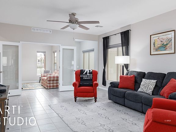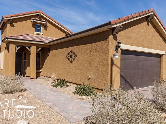 Welcome to Sun City (55+) in Mesquite Nevada. This home was built in 2020 and has been very well cared for by the homeowne It is immaculate. This floor plan will bring you 2 bedrooms, 2 bathrooms plus a den with french doors. The garage is insulated & extended 4ft. The covered front entry has a shady sitting area with pavers in the front & back. As you enter you will notice how bright and clean this home is. There is tile throughout living areas with carpet in bedrooms / closets. Modern ceiling fans will be found in all bedrooms & living area. All windows have custom window coverings that will stay. The bay window in the kitchen brings in great natural light. All kitchen appliances will stay at no additional cost including the washer/dryer. Nutmeg cabinets & smokey pearl granite are great upgrades in the kitchen! The primary bathroom has a dual sink vanity with backsplash. Low threshold tiled walk in shower with thick glass enclosure and a seat. Modern murphy bed found in guest bedroom can stay at no additional cost. In the garage you will find a 6 month new water heater / water softener system. The great sized backyard (.24) is fully fenced!