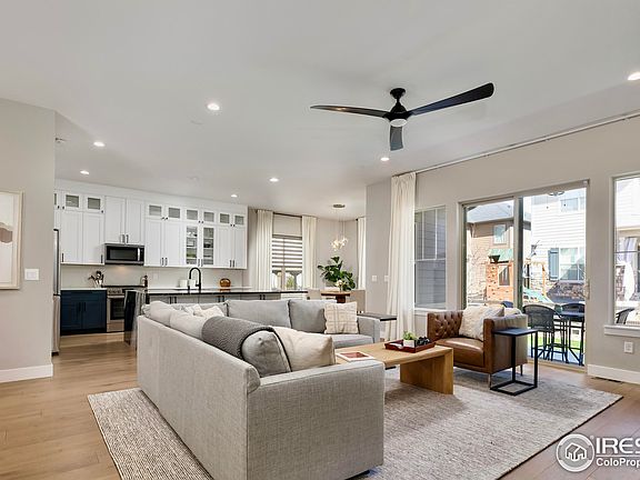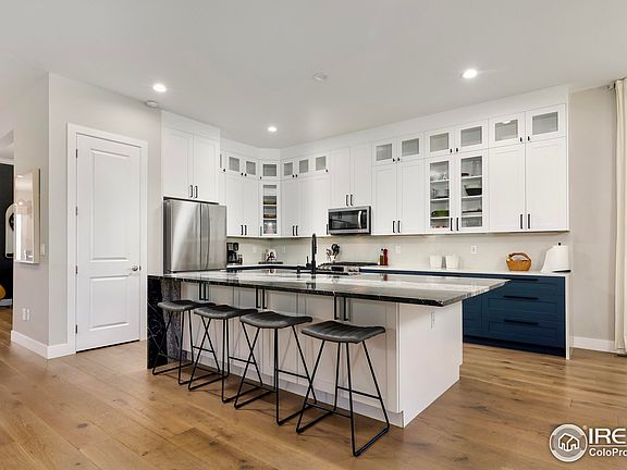 Luxury living in Erie! This ranch-style home has four bedrooms and four full bathrooms. Immediately walk into a stunning entryway with 10' ceilings and light engineered hardwood flooring. The main level consists of the kitchen, living room, dining room, primary bedroom, office, two additional bedrooms, three full bathrooms, and mud room with washer/dryer and sink. Keep the main level conveniently clean with the built-in vacuum system. The office contains a quartz waterfall desk and custom cabinetry. The kitchen defines luxury with two-toned cabinets going to the ceiling, quartz countertops, a gas range, a beautiful waterfall granite island with built-in outlets and cabinets below for extra storage. The kitchen has an open concept, flowing into the dining room and living room with electric fireplace and thick quartz beam with quartz shelving. The large primary bedroom includes an en-suite bathroom with dual vanity, and walk-in closet with custom cabinetry and chandelier. The luxury continues downstairs to the finished basement with a waterfall island with thick quartz countertops and bar with wine cooler. The fourth bedroom includes a spa-like bathroom with thick quartz waterfall countertops, a sauna (included) and heated flooring. The basement is complete with luxury vinyl plank flooring. The current sellers installed artificial turf for easy maintenance in the backyard, along with a Tesla Charger in the garage that can easily be converted into another EV charger. Come live your life in luxury and convenience in this ranch home with tons of natural light! Home is within Boulder Valley School District and within walking distance to Meadowlark Elementary.