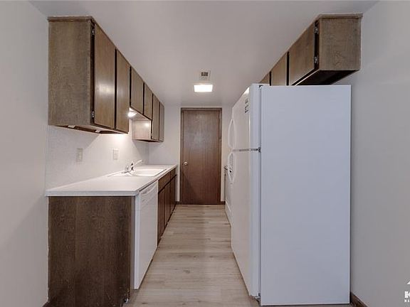 1321 N Sheridan Ave, #104 is a split-level townhome situated near W 13th St N and N West St, featuring luxury vinyl plank flooring, central heating, and air conditioning, a kitchen equipped with an oven/range, refrigerator, dishwasher, and garbage disposal, as well as full-size washer and dryer hookups. Upon entering the home, you will find stairs leading to the lower and upper levels. Downstairs, there is a living room with a decorative fireplace, a galley kitchen with an integrated dining space, and a half bathroom. The upper level features two bedrooms with ceiling fans and double-wide closets with sliding mirror doors, plus a full bathroom with a shower/tub combination. If these townhomes sound like a good fit for you, please get in touch with us to arrange a viewing.