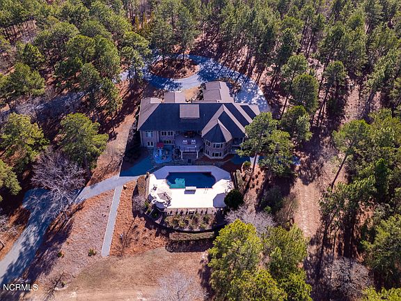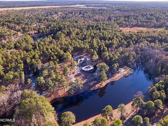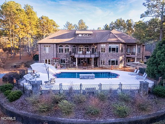 IL VILLA TOSCANA, a 21 acre estate complete with a 6,300 sq ft custom built home, heated Gunite saltwater pool & waterfall, private 2 A½ stocked acre pond, and walking trails for your outdoor enjoyment. Enjoy stunning views from the upstairs balconies and covered porches which overlook the pool, pond, and kids play area. Winner of the 2005 Home Builders Award, the interior boasts 10-14 foot ceilings, custom trim work, archways, beams and amazing living and entertaining spaces! Love to cook and entertain, you'll be overwhelmed with the Chef's Kitchen, Butler's pantry and specialty pantry equipped with the highest quality cooking devices. The kitchen is open to a spacious gathering room with fireplace and access to a large upper deck. The main floor has a King size primary bedroom suite with ensuite and private balcony. The ensuite consists of two separate sinks, 2 walk-in closet and large walk-in shower with multiple heads and Jacuzzi tub with jets for two. Additionally, there are two additional queen size bedrooms with private baths, two half baths on either side of the house and a large laundry room. A grand-wide stairway leads you down to a large family room with a kitchenette & bar, temperature controlled wine cellar with secret room, recreation area, Carolina room, 4th bedroom & full bath, and a flex/gym space all with access to a covered patio with state of the art grill and outdoor kitchen area. There is storage galore and a workshop space on this level. Through the patio you can access the fenced-in pool area, kids playground, and walkways to backyard and private 2 A½ acre pond that is well stocked with Bream/Sunfish, Catfish & Bass. Located approx. 10 minutes drive to downtown Southern Pines, Pinehurst, fine dining & boutique shopping. The Villa produces annual income through Airbnb & VRBO as a vacation home, wedding venue and other corporate events! Septic & Home Insp Dec '22.