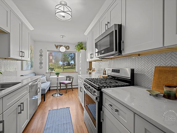 Enjoy stylish and comfortable living in this 1st floor condo in lovely Lombard. Gorgeously renovated eat-in kitchen, complete with white shaker cabinetry, quartz countertops, a herringbone tile backsplash, and modern stainless steel appliances. The expansive living room flows seamlessly into a generous dining area, perfect for relaxation or entertainment. A custom-built "mudroom cubby" area as you enter the home keeps all your essentials organized while being a delightful focal point. The large bedroom includes a spacious walk-in closet, and the hall bathroom has been tastefully refreshed. Enjoy the peaceful view from your patio, which overlooks a vast green space and is alongside a perennial garden cultivated by the owner. Additional amenities include a separate, roomy storage unit. Updated paint, lighting and fixtures throughout the unit. Recently updated entryway, lobby and halls welcome you to this spacious first floor home. Pool, tennis court and (3) dog runs on property. Very convenient to schools, restaurants, shops, train, post office, banks, library and parks.