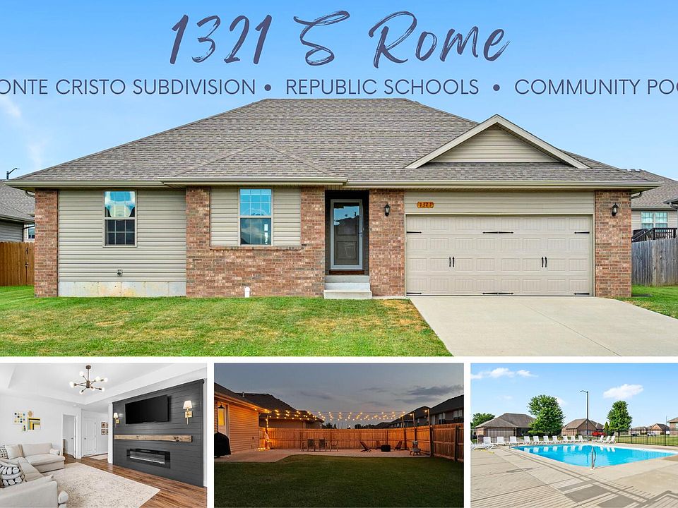 Welcome to 1321 S Rome Ave--a beautifully updated 3-bedroom, 2-bathroom home located in the highly sought-after Monte Cristo subdivision in Republic, Missouri. This well-maintained residence offers approximately 1,356 square feet of thoughtfully designed living space on a generously sized lot. Step inside to discover a bright, open-concept layout that seamlessly connects the living room, kitchen, and dining area--ideal for both everyday living and entertaining. The home has been upgraded with stylish finishes throughout, including sleek quartz countertops, modern light fixtures, and all-new water fixtures in both the kitchen and bathrooms, adding a fresh and contemporary feel. The kitchen features upgraded cabinetry, ample counter space, and a functional design that makes meal prep a breeze. The spacious primary suite includes a private en-suite bath and a large walk-in closet, while the two additional bedrooms offer flexibility for guests, children, or a home office. Outside, enjoy a fully fenced backyard--perfect for pets, kids, or weekend gatherings--as well as an attached two-car garage that provides plenty of parking and storage space. Located in a quiet, sidewalk-lined neighborhood, this home is part of the welcoming Monte Cristo community, which includes access to a neighborhood pool. You'll also appreciate the convenient location near local parks, schools, dining, and quick access to Highway 60. Don't miss the opportunity to own this stylish and move-in-ready home in one of Republic's most desirable communities.