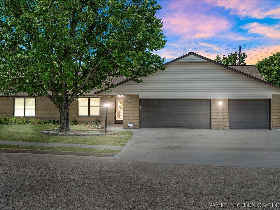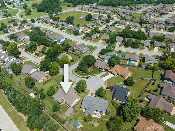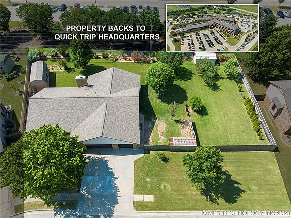 Extremely well-maintained ranch home on a half acre, cul-de-sac lot. Three-car garage, storm shelter, 12x24 shed plus additional storage shed. Spacious living room open to dining area and kitchen. Stainless steel appliances, gas range. Garage entry mudroom with full bathroom and utility hookups. Primary bedroom with ensuite bathroom. Covered patio converted into an enclosed, climate-controlled flex room. Tornado Shelter. Great storage! Large fully fenced yard. Property backs to Quick Trip's lush corporate headquarters with quick access to the BA Expressway