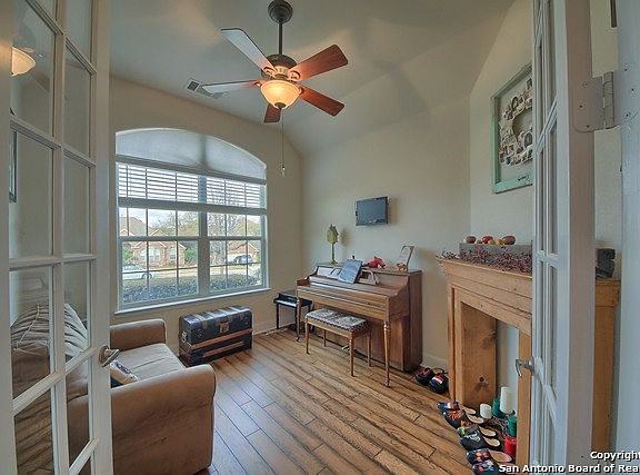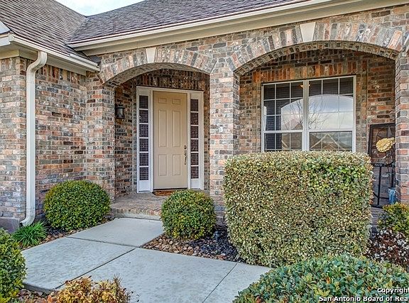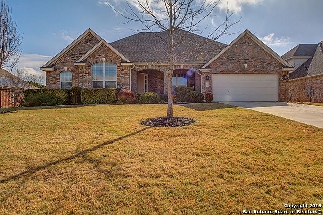 4 bedroom, 3.5 bath with a game room upstairs. Secondary bedroom with own bath. French doors to study. 1/2 acre lot. Open plan, high ceilings. Gourmet kitchen looks into dining and living areas. Arched dining room. Gorgeous landscaping with covered porch, flagstone patio, fire pit and hot tub. Leaf-guard gutters, ranch fencing. Outside access from master and guest bath. Front porch with Hill Country views. Fabulous neighborhood with pool & clubhouse. 3 A/C's. This home has plenty of room for all!