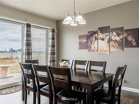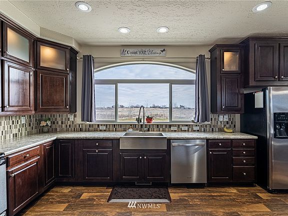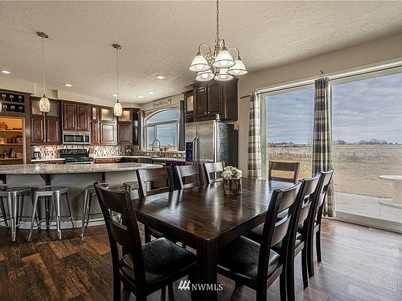 Impeccable 4 bedroom home on five acre parcel! Lots of storage, hidden walk-in pantry, stainless steel appliances, huge kitchen island, rich colors, lots of upgrades, vaulted ceilings, RV parking, grand bathroom off master bedroom, large tinted privacy windows, open floor plan, large laundry room with utility sink. Dining room has large slider door leading to stamped concrete patio, fully fenced dog run, and outbuildings.