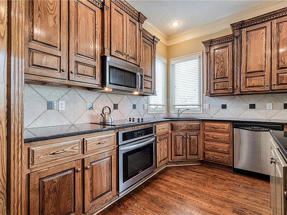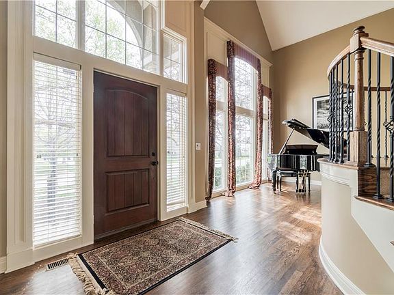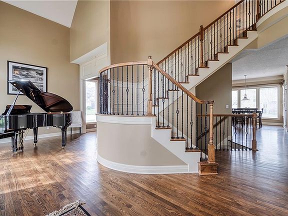 Former model home in coveted Wilshire Place neighborhood featuring 4 bedrooms, 3 full baths, 2 half baths, 3 car garage, and a finished daylight basement with wet bar, half bath, and plenty of storage. As you walk in the beautiful entry you will be greeted with an open and bright floor plan with 2 story soaring ceilings in the entry, tons of windows, and 10 ft ceilings throughout the main level. The home features hardwood floors, granite counters in the kitchen, large kit island, walk-in pantry, stainless appliances, see through fireplace from Great Room to bonus office/bedroom on the main level w/ private entry from the 3rd car garage. Large room sizes, crown moldings, 2nd floor laundry room, walk-in closets, huge master bathroom with walk in shower, large tub and ample closet space. New Roof in 2023! Close to Gezer Park, Price Chopper and Mission Trail Elementary. Minutes from Prairie Fire and Corbin Park entertainment areas. Enjoy the pool, sport court, tennis court and play area just down the street.