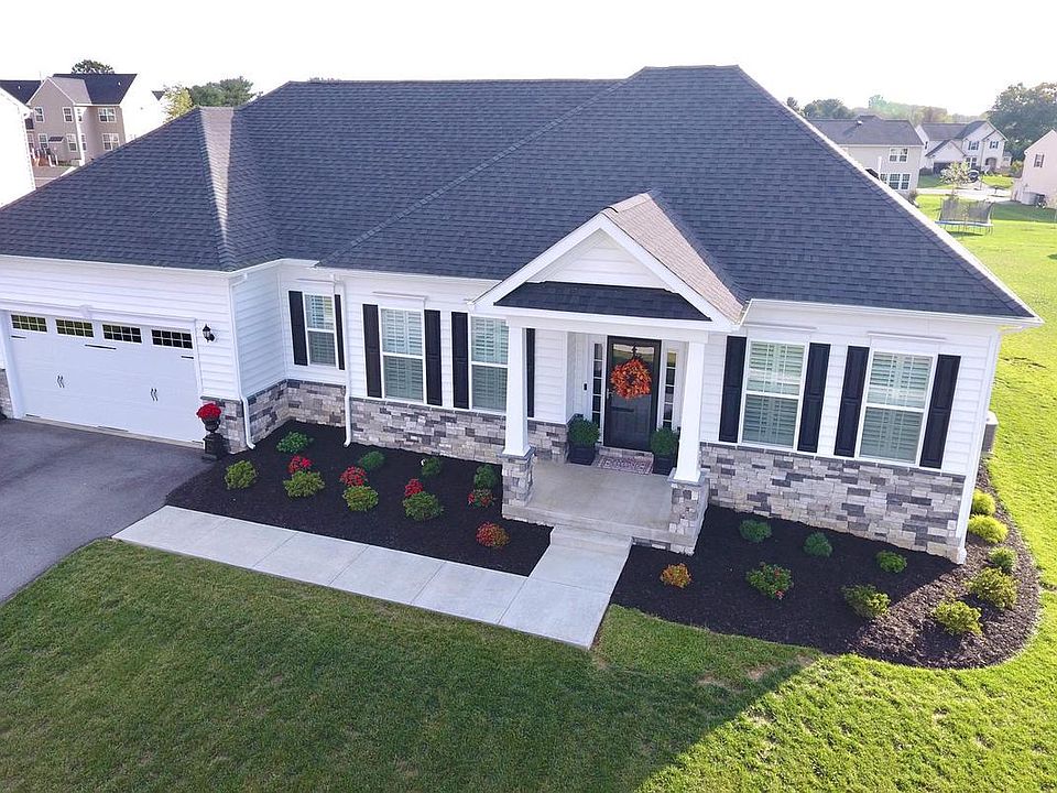 Absolutely stunning Weston Floorplan offering one level living, 1880+ sq ft of living space, 3 Bedrooms, 2 Full baths and high end finishes including beautiful plantation shutters throughout home! Entering through the foyer, you will find hardwood flooring throughout the Formal Dining Room with tray ceiling, Family Room with custom built-ins, Gourmet Kitchen with marble counter tops, raised panel cabinetry, breakfast bar, and slate appliances. The right wing Primary Owner's Suite with over sized walk in closet has a luxury bath complete with frameless shower door and custom bench seat and built in shelf! On the left wing of the home are the two additional bedrooms with upgraded carpet and a shared full bath with tile and double sink. Full unfinished basement is ready for you to make your own with walk out stairs to the outside yard. Gorgeous rear covered patio area perfect for enjoying a peaceful evening at home. 2 car attached garage with expanded garage door and laundry tub. This LIKE NEW home is truly a must see! ** HOME INSPECTOR/APPRAISER - PLEASE SCHEDULE THROUGH SHOWING TIME ONLINE***