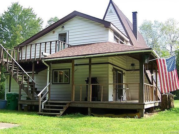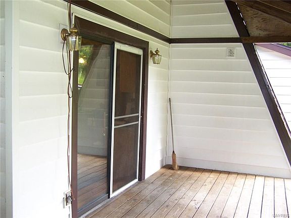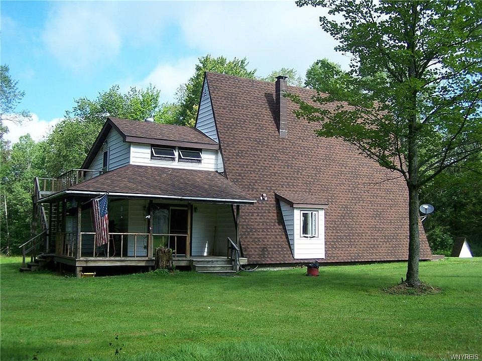 Spectacular A Frame style home on 5 acres of wooded land in the middle of hunting country! Several patios and decks surround the outside. Kitchen features corium Counter tops and cupboards galore! There is 4 different Balconies and Decks on different sides of the house to enjoy. For the sportsman, there is a large stocked pond and the deer walk through the yard! The furnace was just put in New and features central Air Conditioning! The Main bathroom has a walk in whirlpool tub! There is an outside staircase to the basement. Cable internet will be available in September, call for details.