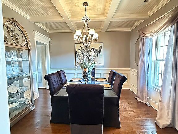 - DINING ROOM DESC: Wood Floor, 10? + Ceiling, Smooth Ceiling, Chair Rail, Crown Mold, Coffered Ceiling