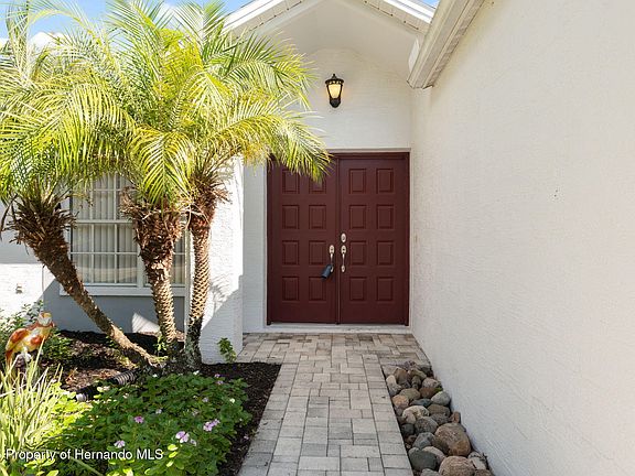 This spacious 4-bedroom, 3-bathroom home combines timeless design with peaceful surroundings, offering both comfort and functionality for everyday living. Set back on a quiet street, the home makes a strong first impression with its light exterior, mature landscaping, and a paver driveway that leads to a two-car garage. A slightly elevated front entry, lined with decorative rocks and manicured plants, draws you to the welcoming double doors beneath a warm overhead light. Inside, you're greeted by airy vaulted ceilings, soft neutral tones, and luxury vinyl plank floors that flow effortlessly through the main living areas. The living room's open layout is enhanced by natural light streaming through large windows, while a statement ceiling fan with sculpted leaf-style blades adds a touch of character. The adjacent dining space offers a perfect setting for everyday meals or gatherings, illuminated by a classic chandelier with sliding glass doors that lead directly to the backyard. The kitchen brings both charm and practicality with white cabinetry, a tiled backsplash featuring mosaic accents, stainless steel appliances, and a breakfast bar illuminated by modern pendant lights. The primary suite is a private retreat with soft carpet, double closets, and an en suite bathroom complete with a walk-in shower, updated vanity, and framed mirror. Three additional bedrooms provide versatile living options for guests, family, or work-from-home space—each featuring ceiling fans, natural light, and ample closet storage. All bathrooms have been thoughtfully designed with neutral finishes and functional layouts, including one with accessible features such as a grab bar. The laundry area is conveniently located in the garage, offering storage shelves and an access door to the backyard. Outside, the fully fenced yard offers a peaceful escape with a paved patio perfect for outdoor dining, a charming gazebo with railing, and a variety of mature trees that provide shade and privacy. There's also a shed for extra storage, making the backyard as practical as it is inviting. Located just 2.5 miles from Delta Woods Park, where you'll find walking trails, sports courts, and picnic areas, and only 3.1 miles from the famous Weeki Wachee Springs State Park, known for kayaking, crystal-clear waters, and natural attractions. For everyday convenience, shopping and dining options are less than 4 miles away. Plus, the Suncoast Expressway is just 6.7 miles from the home, providing a smooth commute to Tampa, making this property an ideal blend of quiet comfort and commuter convenience—ready to welcome you home.