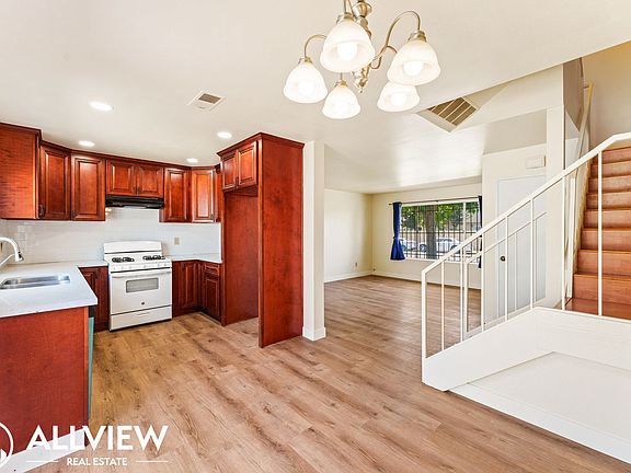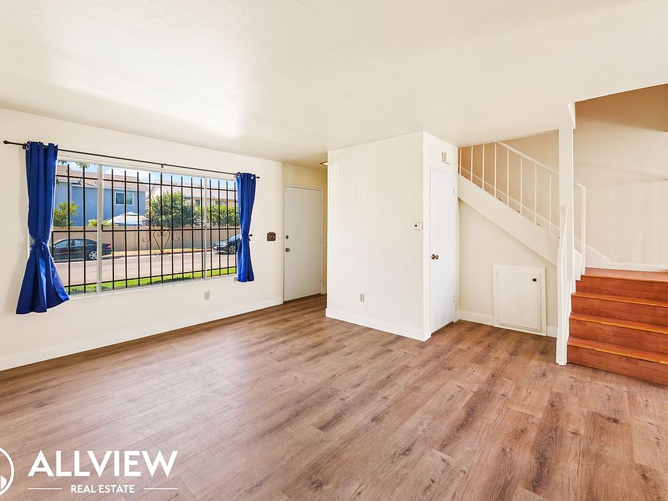 Welcome to this charming 3-bedroom, 1.5-bath townhouse in the heart of Garden Grove! Step inside to be greeted by the living room with sleek vinyl flooring, a convenient storage closet, and a temperature control thermostat. Off the living room, you'll find a stylish half bath featuring beautiful wainscoting, quartz countertops, and a modern light fixture. The kitchen boasts rich wood cabinetry, recessed lighting, and quartz countertops, perfect for any home chef. Adjacent to the kitchen is a cozy dining area with a sliding door leading to your private patio. Ideal for outdoor relaxation and entertaining! Upstairs, you'll find two secondary bedrooms, with vinyl flooring, recessed lighting, and window coverings for added privacy. The full bathroom includes a tub-in-shower combo, tile flooring, and chrome finishes. The primary bedroom is a true retreat, offering a large window allowing for ample natural light and a spacious walk-in closet. This home also includes a 2-car garage for secure parking. The community features fantastic amenities, including a pool, spa, clubhouse, and playground, offering resort-style living just steps from your door!