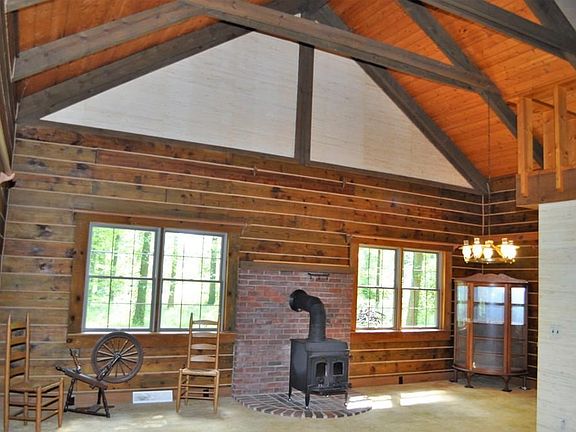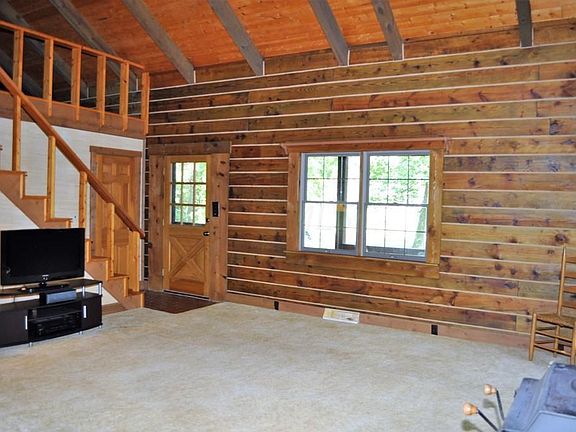 Your very own cabin in the woods! Inside you'll find the great room w/soaring ceilings, log beam accents, & a wood burning stove w/brick hearth. A well equipped kitchen w/appliances, ample counter/cabinet space, & deck access. Desirable open concept layout from the great room into the dining room & kitchen areas! 2 bedrooms & full bath also situated on the 1st floor. Upstairs is complete w/a loft area & spacious 3rd bedroom. Full walk-up basement w/rec room for additional living space! 2 car detached garage. Easily entertain in your new home all year round! In the winter enjoy cuddling up in the great room w/warmth from the wood burner. In the Spring/Summer/Fall you can relax on the covered front porch OR back deck while enjoying the wildlife & serene setting. Welcome Home! (1 owner home)