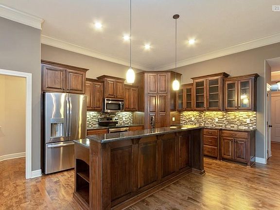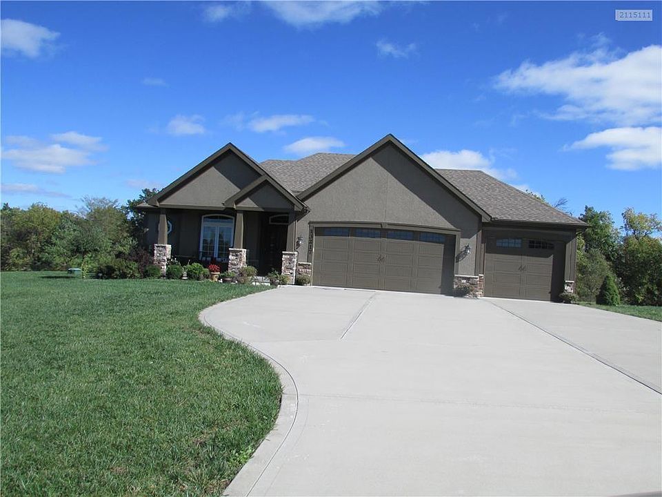 Reverse/Ranch plan with full finished walk-out basement. Great kitchen with granite tops, pantry, and custom cabinetry. Covered deck, lower level is finished with full kitchen, family room, and 4th bedroom. Large garage doors and bays for over-sized truck, SUV's and boats. Master suite offers huge walk-in shower, walk out to deck, double vanities, walk-in closet, adjoining laundry room. Lot backs to trees, great location for commuting to Liberty, Kearney, KC and Smithville.