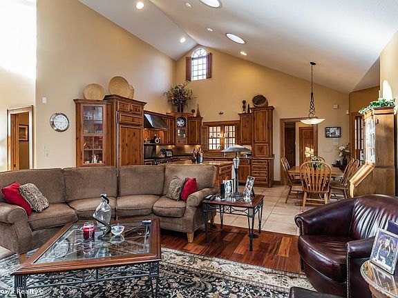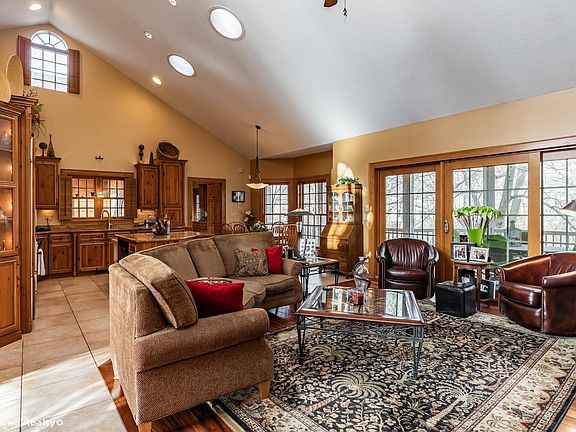 1.5 Story Home on large lot trees. Was Builders own home so has many custom features, great room high vaulted ceilings & cherry wood floors & fireplace. Kitchen has custom knotty pine cabinets & granite counter. Tile floors are heated on first floor. Kitchen appliances are Sub Zero, Dacor & Bosch. Large bonus room on 2nd Floor with Private Entrance plus AC and bath. Extra's include irrigation, central vac, security, sound system. Walkout basement family room & fireplace, 2BRs, bath, hobby room & lots of storage. Newer furnace's & central air. Hot tub will stay if wanted, "free". New gutter guards.
