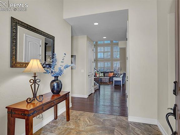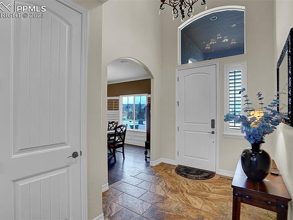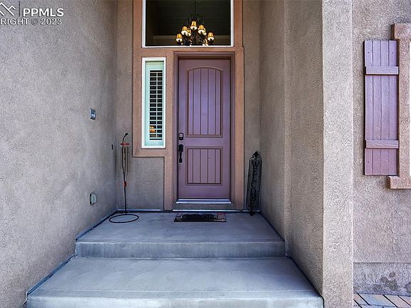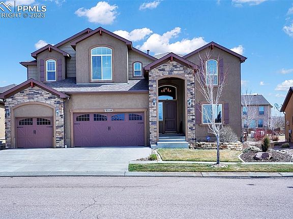 Stunning home located in the Village of Saratoga & within walking distance to Frog's Leap Park. The home faces west, allowing for quick snowmelt in the winter & cool summers on the back patio in the summer! The covered arch entryway leads you into a two-story entryway adorned w/ travertine tile, a closet, & an archway adjoining the dining room. The dining room features crown molding, wood flooring, gorgeous Pikes Peak views, & wainscoting. Located just off the dining room is a butler's pantry w/ a built-in wine rack, upper & lower cabinets, a granite countertop, & an adjoining walk-in pantry. The kitchen offers double ovens, 42" cabinets, granite counters w/ an under-mount sink & tile backsplash, a spacious island w/ bar seating, & an attached eating space nook that walks out onto a concrete patio for outdoor dining! The great room has a two-story ceiling & windows, a gas fireplace accented w/ a wood mantle & stone, & wood floors. Tucked away on the other side of the garage access is a quiet bedroom/office attached to a full bathroom. At the top of the open staircase from the great room is a spacious loft that leads to a 5x9 laundry room adorned w/ tile flooring, a sink, upper cabinets, & a full storage cabinet. This upper level also features three secondary bedrooms, a full bath w/ tile flooring, a raised vanity with double sinks, a tub/shower combo, & a linen closet. The master bedroom offers a grand entryway w/ French doors, a vaulted ceiling, a sitting area, gorgeous Pikes Peak & AFA views, & a 7x11 walk-in closet. The attached 5 piece bathroom is adorned w/ tile flooring, a walk-in shower w/ tile walls including a mosaic inlay, custom rock floor, & a view of Pikes Peak from the jetted tub. The unfinished basement has a rough-in for a bathroom & 9ft ceilings. Many features about this home include 2 furnaces, 2 new water heaters, 2 A/C units, plantation shutters throughout, 8ft interior doors, solar landscape lighting, meticulous landscaping, & more!