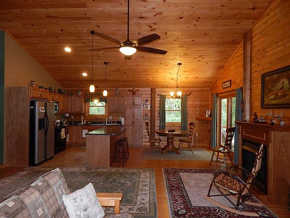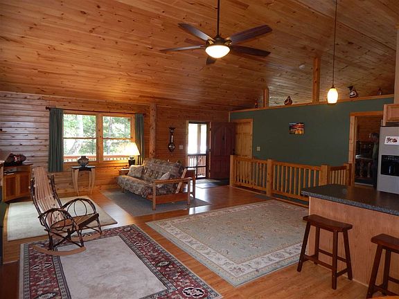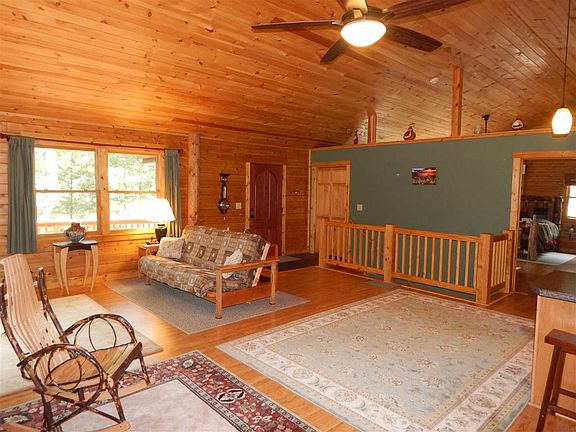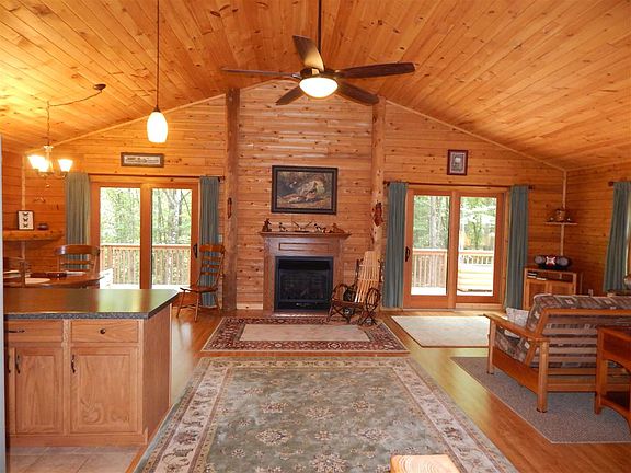 Covered front porch welcomes you inside to cathedral ceilings! Family room with 2 sets of sliders, kitchen with breakfast bar, and dining area with built-in storage seat, and access to the wrap around deck! Choice of 2 master bedrooms! Master bedroom on the main floor is spacious with master bath with separate tub and shower, and walk-in closet/laundry room! Master bedroom in the basement with full bath/shower only. Basement has Superior Wall Foundation with a 15 year guarantee for no water penetration! Outside door to access the deck to the backyard. Garage with workshop/office area! Storage building! Custom built with Katahdin Premium Cedar logs known for being naturally pest resistant, and keeping cooling/heating costs low due to it's thermal mass! Home is nestled on 3.51 wooded acres with privacy!