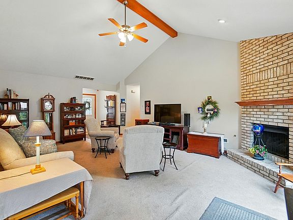 Discover all that this beautifully maintained 3-bedroom, 2.5-bath one story home has to offer! Located on a peaceful cul-de-sac, this property sits on a spacious quarter-acre lot and features meticulous landscaping, a 28x10 patio, and a charming pergola—perfect for outdoor entertaining. Inside, you'll find a bright and inviting living room with vaulted ceilings and a cozy gas fireplace. The open-concept kitchen and dining area provide a great space for gatherings, with plenty of cabinet storage and stainless steel appliances that stay with the home. A convenient laundry room and half bath lead to the oversized, heated 2-car garage. Down the main hallway are two generously sized bedrooms with ample closet space. The large owner suite offers a peaceful retreat, complete with tray ceilings, a walk-in closet, and a spacious en-suite bathroom. Newer Furnace and Central Air! Come see for yourself and experience everything this wonderful home has to offer!