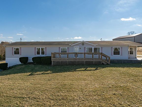 32x80 Doublewide on full basement with walkout. Property is situated beautifully on 8.51 acres and boasts a 1/2 acre stocked lake. Home features 4BR's, 2 full BA's and 2 half BA's. Large kitchen with island, cabinets galore, pantry, refrigerator, stove, dishwasher and trash compactor. Laundry room complete with washer & dryer and is adjacent to the kitchen and a 1/2 bath. Breakfast nook/office/study/reading room overlooks the lake. Spacious 15x16 formal dining room. 19x14 living room with walkout to front deck overlooking the lake and land. Master BR offers adjoining master bath with stand-alone shower, walk-in closet, make-up/vanity room and a separate sitting/reading room. Central vac. throughout the home. 24x28 2 car detached garage with concrete floor. 28x60 2 car detached oversized garage with concrete floor, electric and lots of storage. 5-year newer windows. 2011 newer roof. Circular blacktopped drive. Rear deck on back of home. 2 skylights. Two furnaces, 1 for main floor of home and 1 for basement area (partially finished with 1/2 bath.) Central Air throughout. Home is already hardwired for a generator in the event of the loss of electric during storms.