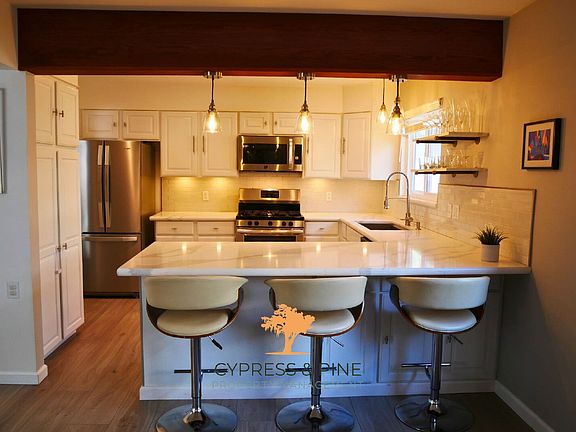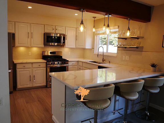 This beautifully updated 3-bedroom, 2-bathroom home offers modern comfort in a prime location. The open-concept living area features a cozy fireplace, recessed lighting, and abundant natural light. A gourmet kitchen boasts stainless steel appliances, quartz countertops, and a breakfast bar. The primary suite includes plush carpeting, a walk-in closet, and a stylish ensuite bath with a double vanity and glass-enclosed shower. Additional rooms provide versatile space. Enjoy a private backyard oasis with a redwood deck, lawn, and fenced yard. Additional features include hardwood flooring, modern fixtures, a laundry area, and an attached garage. Located near shops, dining, and scenic coastal trails.
