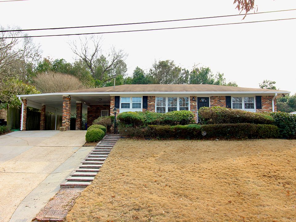 Newly updated single level brick home with fully fenced back yard. Perched up from the street, this home offers plenty of space. Large front porch leads you into main Living room & Dining area with gorgeous refinished original hardwood floors, updated paint and light fixtures. Kitchen with new tile floors, granite countertops, and stainless steel appliances. Laundry room with attached half bath. Additional living space/den at center of home with sliding glass doors to screened porch. Master Bedroom with ensuite bath. Separate hall with 2 additional bedrooms with hall bath. New ceiling fans, carpet, tile, vanities and tub/shower. Patio off screened porch with fully fenced backyard. Shed, utility closet and 3 car carport. Home qualifies for Synovus' 100% loan with NO PMI and NO INCOME LIMIT!