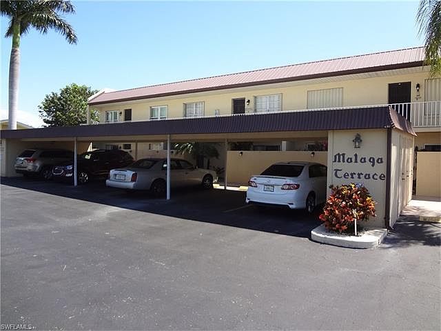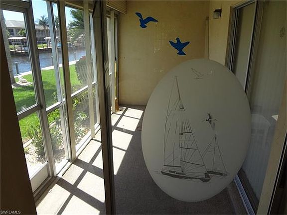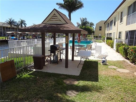 Affordable gulf access condo in GREAT location!!! 55+ condo. Convenient to Del Prado Blvd and downtown Cape Coral!! GROUND FLOOR, END UNIT!! 2 bedrooms plus den/dining/office area in front of condo, with sliders to landscaped courtyard area, & 2 full baths. COVERED PARKING with one assigned space, plus open guest parking. Unit has it's own storage closet outside too! BOAT DOCKS with quick access to the river! HEATED POOL with new heater! Seller replaced kitchen cabinets, both bathroom's cabinets, sinks & toilets. Some 'newer' window coverings, range/oven, & dishwasher. Roll-down shutters on lanai, and accordion shutters along back windows. Inside laundry! Two sets of sliders to screened lanai! Walk-in closet off master bedroom! Please note that water/sewer IS included in monthly H.O.A. fees! Seller is providing a HOME WARRANTY to buyer at closing too! Per V.P. of condo association, all three buildings have been re-roofed within the last 5 years, and the pool area is being re-done in May, plus exterior of buildings to be painted in the fall. Reserves will be used to pay for these items, so no special assessments, per V.P., and unit owner!
