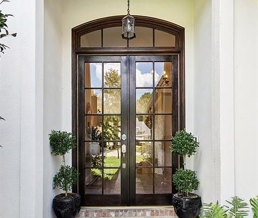 The classic brick & stucco exterior is accented with charming shutters and lush landscaping. A welcoming double glass door and lantern-style pendant sets the style. The home combines timeless elegance with modern comfort and offers generous living spaces.
