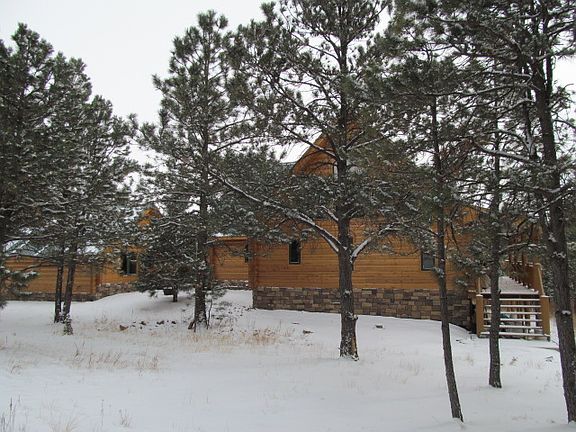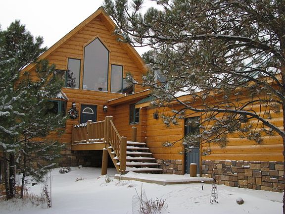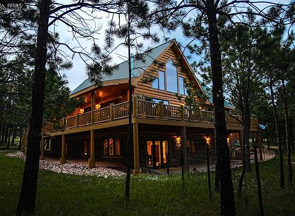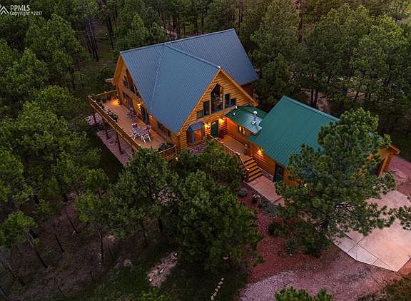 Colorado log home tucked in the towering pines on 4.99 acres in award winning School District 20! Upon entering the home you are greeted by the welcoming and bright great room with exposed beams, a wall of windows, spacious and open floor plan with dramatic vaulted ceilings, gas stove and a walk-out to the 10x40 uncovered deck and a 8x40 covered deck with gas hook-up and recessed lighting. Located in sought after cul-de-sac! The home features a kitchen perfect for entertaining guests with custom high end cabinetry, slab granite counters, under cabinet lighting and stainless steel appliances including a convection oven. Hand trowel texture, oil rubbed bronze fixtures, solid wood 6-panel doors and casement windows throughout. The home is perfectly situated on the treed and mitigated lot to provide much privacy. Main level master suite with two walk-in closets and a 5-piece bath with jetted tub! The upper level of the home is a loft which could easily be converted to two additional bedrooms. Fully finished walk-out basement with log accents, spacious family room with a wet bar, walk-out to the lower level patio and fenced dog yard. The basement has two additional bedrooms including a en-suite bedroom with a full bath and large walk-in closet which would be perfect for an in-law/teen suite! Zoned for horses. Two large sheds included. No covenants or HOA.