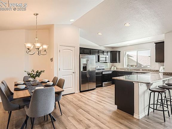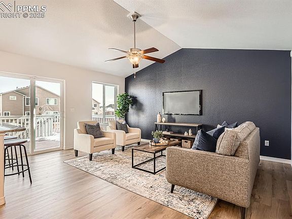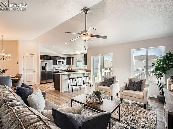 Welcome to this stunning 5 bedroom, 3 bath, 3-car garage home located in Meridian Ranch in the desirable D-49 school district! The main level boasts new luxury vinyl flooring, vaulted ceilings, an open-concept living area, fresh paint, and new carpeting throughout. The kitchen is a chef's delight, equipped with stainless steel appliances, granite countertops, a pantry, and plenty of space for cooking and gathering. Adjacent to the kitchen is a large dining area, perfect for hosting or entertaining. The expansive master suite includes a luxurious 5-piece bathroom with dual vanities and a generous walk-in closet. Additionally, the main level hosts a second bedroom, a third bedroom or office - has been used as both, a full bathroom, and convenient laundry room. The fully finished garden-level basement offers two additional bedrooms, a full bathroom, a storage room, and a large family or recreation area, providing versatile living space. Outside, the professionally landscaped yard features a fenced backyard, a large stain-stamped concrete patio, and a Trex deck, perfect for enjoying the beautiful Colorado outdoors. The oversized, insulated three-car garage offers abundant storage. With air conditioning, this home ensures comfort during the warm summer months. The community enhances your lifestyle with a recreation center, pools, and a fitness facility. Conveniently located near schools, parks, shopping, and entertainment, this home provides easy access to all amenities. Don't miss the opportunity to make this move-in-ready property your own!