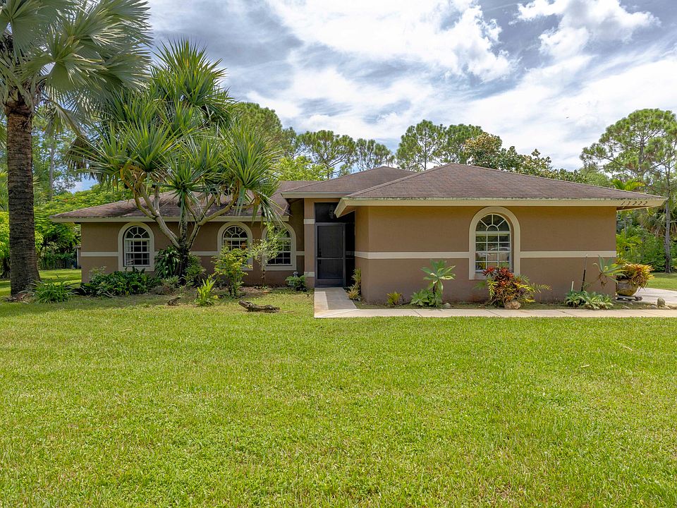 This 3-bedroom, 2-bathroom.Beautiful home in Acreage. Tropical landscape with fruit trees. and a pond on a private 1 1/4acres of land. Home has high vaulted ceilings, kitchen has new appliances. Additional amenities include private pond with water system, 1 shed, large chicken coop, hurricane shutters, water filter system for the home, garage has A/c split. a/c ,water heater 2017, fenced in.lawn mower is negotiatable. Washer and dryer not included.