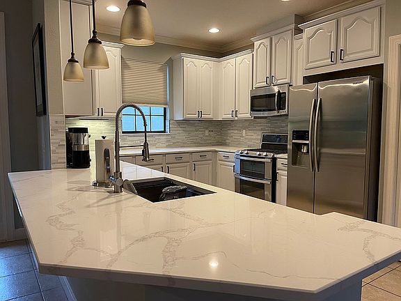 - Interior Features: Ceiling Fans(s), High Ceiling(s), Open Floorplan, Split Bedroom, Stone Counters, Walk-In Closet(s), Crown Molding, Solid Wood Cabinets, Kitchen/Family Room Combo, Window Treatments, Tray Ceiling(s), Pest Guard System