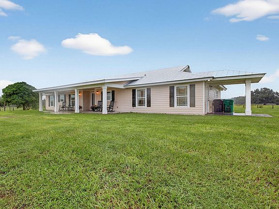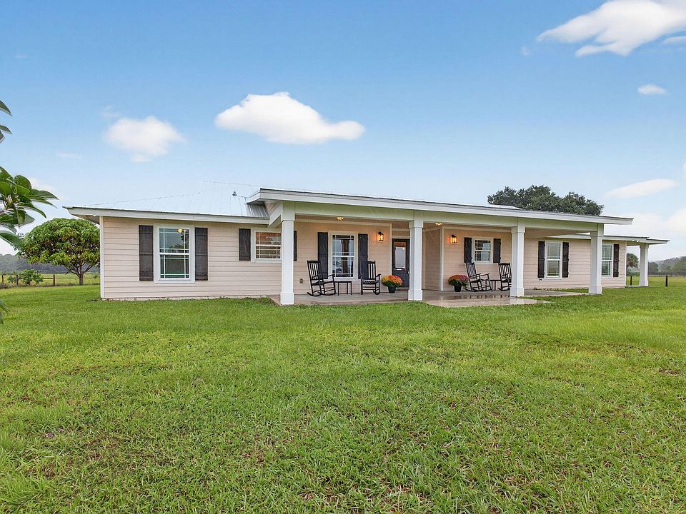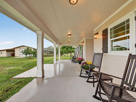 Take a look at this gorgeous equestrian estate - country charm at its finest! Gorgeous farmhouse located on 10.12 acres in gated equestrian community. Beautifully appointed 4 bedroom, 3 bath house with separate 1,128 SQ air conditioned garage. The property also features a barn with two stalls, large self-watering chicken coop and air conditioned tack room. Stocked pond, fruit trees including avocados and mangos, fully fenced lush green pastures with cow pens, and friendly fox squirrel who likes to look in the back door round out the amenities! The neighborhood offers equestrian trails. This is rustic charm with all the modern comforts desired!