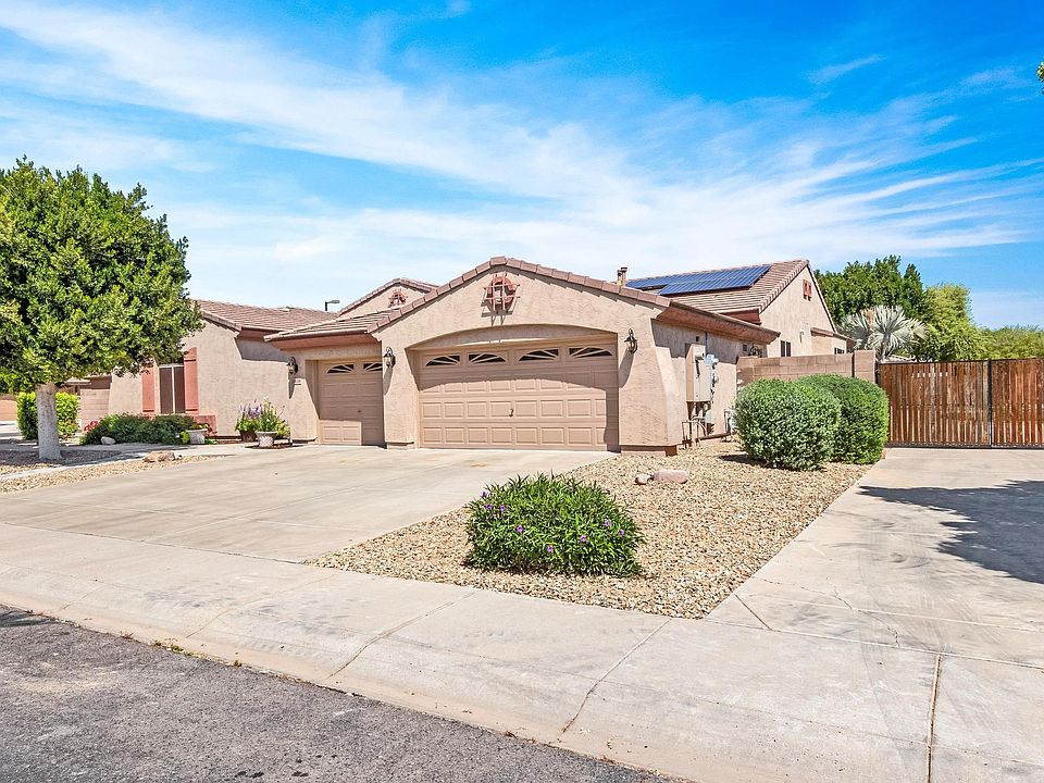 Premium N/S corner lot home is gorgeous inside & out! Original owners have taken immaculate care of everything. Backyard has outdoor oasis with a sparkling pool, plenty of shade, a putting green and a place to garden. Beautiful curb appeal with mature shade trees, RV gate & Slab with a 4 foot extended 3 car garage. The High ceilings and 8 ft doors really help showcase this home. Kitchen has a huge granite slab providing a lot of workspace, Gas Cook Top, Brand New Double Ovens, Walk-In Pantry and lots of Cabinetry. This highly desired model has an abundance of space to entertain and gather with friends & family! Custom laundry Room with lots of cabinets and wash sink. SO many extras! OWNED solar to save you BIG money in the summer. Highest electric bill was only $81.58 last August!