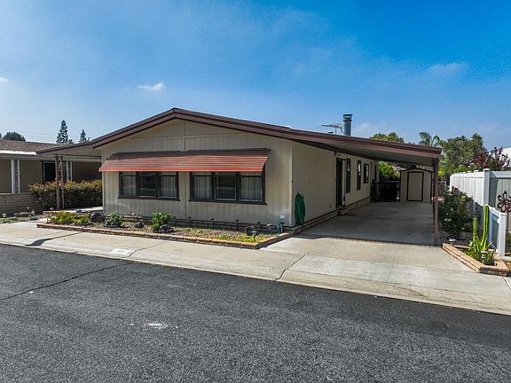 NO SPACE RENT. OWN BOTH THE MANUFACTURED HOME AND THE LAND. This home has a fabulous location close to the clubhouse in the prestigious senior community of Royal Carriage Estates in Redlands. All occupants must be 55 years of age or older - no exceptions. There is a magnificent view across the greenbelt to the mountains beyond! The home has 1680 square feet and boasts a spacious living room plus a large family room with fireplace and vaulted ceilings. The kitchen has newer appliances, lots of cabinets and a window to enjoy the view. The refrigerator is included, as are the washer and dryer in the separate laundry room. There is a covered patio and fruit trees in the rear yard. A permanent foundation is also a plus. Low Homeowners Association fee includes water, trash and sewer plus maintenance of the common areas, pool, clubhouse and all amenities.