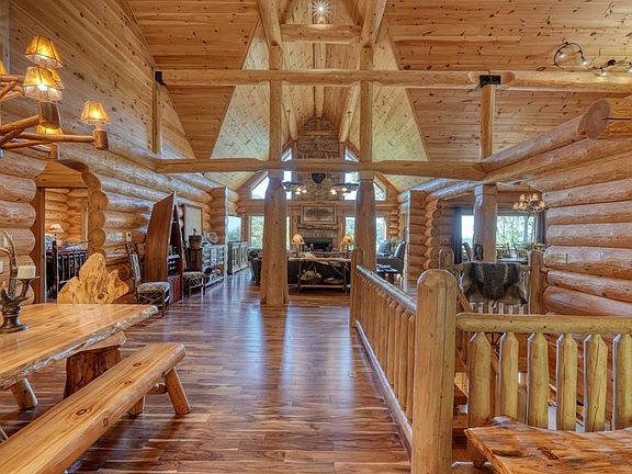 Waterfall counterMaster craftsmanshipHot tubIncredible wood carvingsCozy porchesMassive hand-hewn logsLarge lot