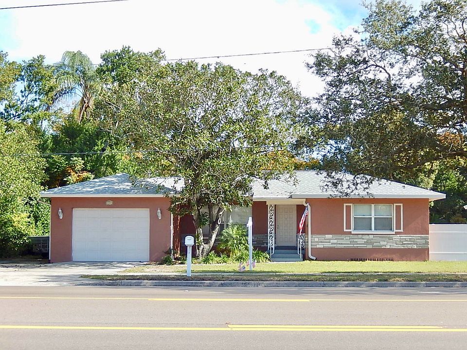 Welcome home, move in ready, roof is 2018,and updated kitchen completed in 2008, 2 car garage extended double size (17X40) and permitted in 2005 with an added master bedroom with master bath. Desirable 3 bedroom split plan. kitchen, living room, dining area and family room offer an open concept. Family room has access to an extended wood deck and to the tiki-bar and a tree swing in the fenced backyard. Over-sized Master bedroom has two walk in closets, one of the walk in closets is unfinished but matching laminate flooring available, also two ceiling fans and newer laminate floors. Kitchen has all hard wood cabinets, closet pantry and plenty of counter space, built in microwave and decorative tile floor. Home offers original hardwood flooring, and the original whole house fan in the attic. The garage is a special place for you guys looking for the perfect man cave that offers a work shop, wired for power through, also the master bath is accessible through garage as well. The north side of the home has room to park an RV or a boat. Minutes to shopping, famous Clearwater Beach A must see home.